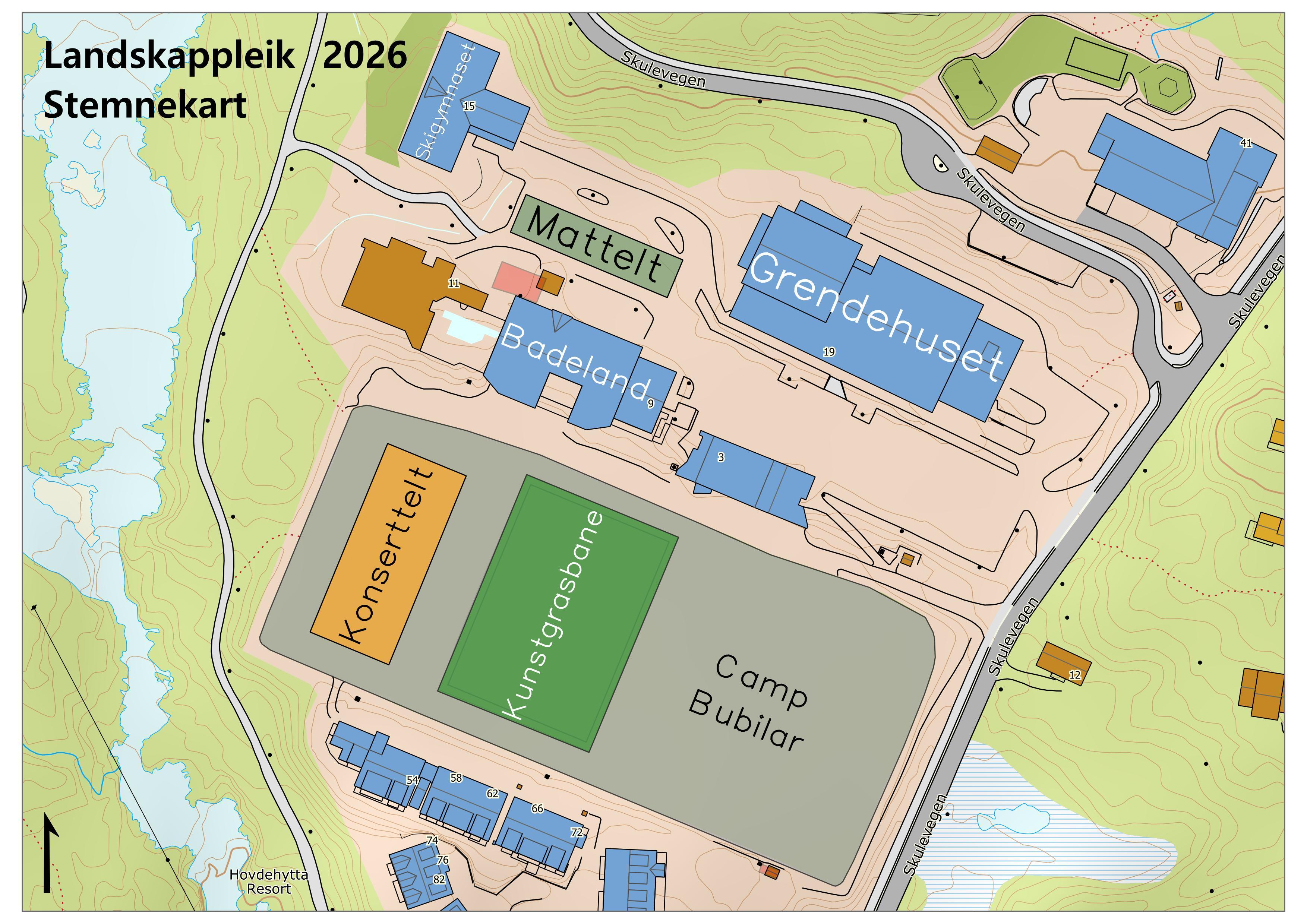 På landskappleiken 2026 på Hovden blir det kort veg til alt. Arenaen er lokalisert kring grendehuset på Hovden. Vi har to salar inne i grendehuset og vil setje opp eige konserttelt som hovudarena like ved. Vi får og eige serveringstelt på arenaområdet.